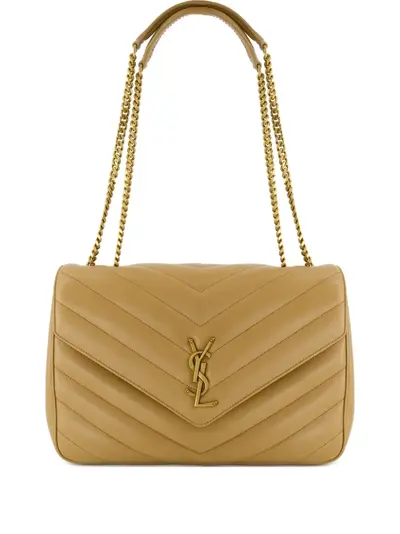 light brown chevron pattern metal logo lettering chain strap press-stud fastening internal slip pocket