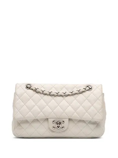 quilted caviar body leather woven chain link straps double front flaps with interlocking Cs twist lock closure exterior back slip pocket interior zip and slip pockets white Serial Number: 12884996 This item has no inclusions. Condition: FAIR. This previously owned and used item is in fair condition with visible signs of use. This may include fading of material or plating, loose stitches, discolouration, patina or heavy scratches. Declared Damages: Handle/Strap Feature(s) Minor Peeling. Please refer to the photos on this product page for a detailed view of the item, including any damages declared.
