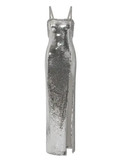 silver sequin embellishment open back square neck embellished straps thigh split