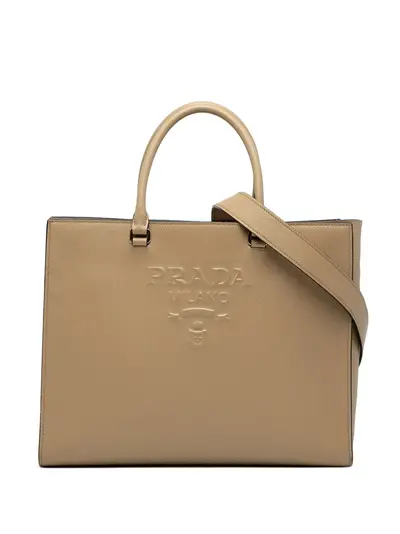 saffiano leather body with embossed logo rolled leather handles detachable flat leather strap open top interior zip and slip pockets brown Inclusions: dust bag, authenticity card, shoulder strap. Condition: EXCELLENT. This previously owned item is in near-perfect condition with no signs of damage or use. Please refer to the photos on this product page for a detailed view of the item, including any damages declared.