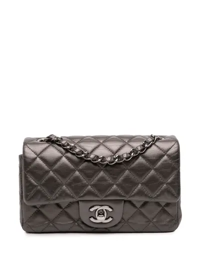 quilted lambskin leather body leather woven chain strap top flap with CC turn lock closure exterior back slip pocket interior zip and slip pockets gray Serial Number: 18569400 This item has no inclusions. Condition: GOOD. This previously owned and used item is in good condition with minimal signs of use. This may include fading of material or plating and scratches. Please refer to the photos on this product page for a detailed view of the item, including any damages declared.