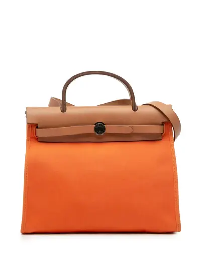 canvas body with leather trim flat leather top handle flat leather shoulder strap front flap with pull-through strap closure exterior back zip pocket detachable interior zip pouch orange Serial Number: ▢N Inclusions: pouch, padlock, key. Condition: GOOD. This previously owned and used item is in good condition with minimal signs of use. This may include fading of material or plating and scratches. Declared Damages: Exterior Bottom Feature(s) Minor Peeling. Please refer to the photos on this product page for a detailed view of the item, including any damages declared.