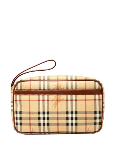 coated canvas body with leather trim flat leather wrist strap top zip closure interior zip pocket brown This item has no inclusions. Condition: EXCELLENT. This previously owned item is in near-perfect condition with no signs of damage or use. Please refer to the photos on this product page for a detailed view of the item, including any damages declared.