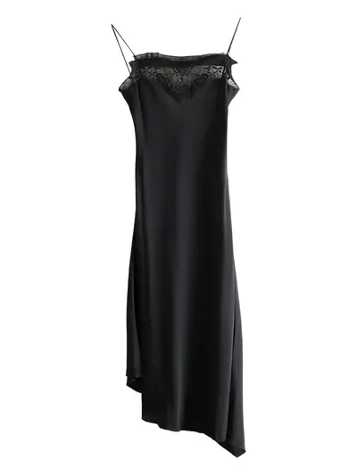 black silk lace detail spaghetti straps asymmetric hem midi length