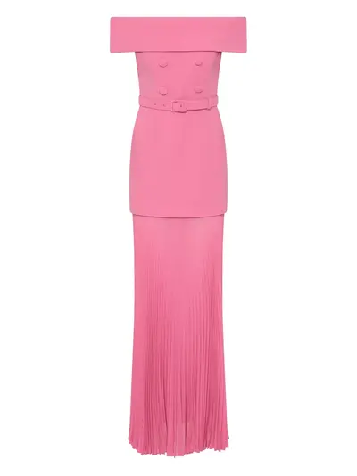 pink off-shoulder design belt button embellishment pleated skirt midi length
