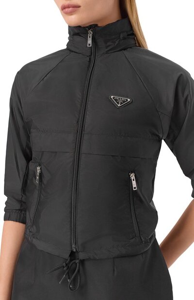 Укороченную ветровку из вторичного нейлона Re-Nylon украсили фирменной треугольной эмблемой. По низу предусмотрели кулиску, а в воротнике-стойке скрыли капюшон. Куртка с эластичными манжетами, как и боковые карманы, застегивается молнией.