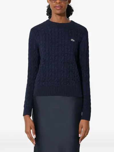 dark blue cable knit logo appliqué crew neck long sleeves ribbed hem