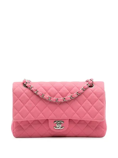 quilted jersey body cotton-woven chain shoulder straps double front flaps with CC turn-lock closure exterior back slip pocket interior zip and slip pockets pink Serial Number: 19375179 This item has no inclusions. Condition: GOOD. This previously owned and used item is in good condition with minimal signs of use. This may include fading of material or plating and scratches. Please refer to the photos on this product page for a detailed view of the item, including any damages declared.