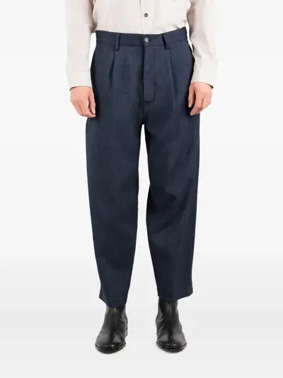 blue pleat detailing belt loops button and fly fastening rear patch pockets tapered leg