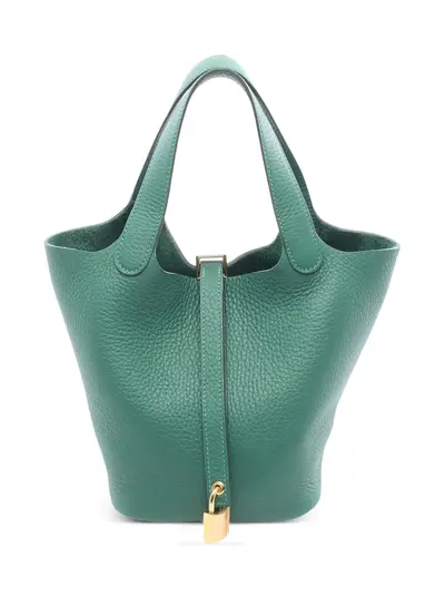 Clemence leather body flat handles open top with a pull through strap and lock closure green Inclusions: dust bag, padlock, key. Condition: EXCELLENT. This previously owned item is in near-perfect condition with no signs of damage or use. Due to the exclusivity of this item and its limited availability, processing and delivery might take longer than usual. Please refer to the photos on this product page for a detailed view of the item, including any damages declared.
