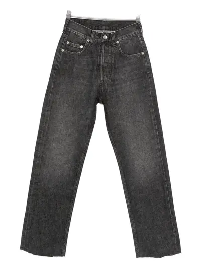 grey front button and zip fastening classic five pockets frayed hem rear logo patch