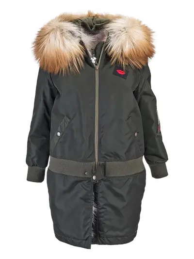 khaki green faux-fur trim appliqué logo front zip fastening side press-stud pockets long sleeves