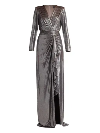 silver metallic finish V-neck long sleeves pleated bodice draped waist side slit