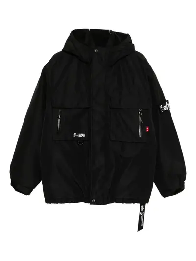 black concealed zip and touch-strap fastening drawstring hood two front flap pockets