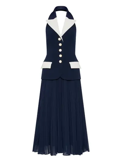 navy blue halter neck button embellishment pleated skirt panelled construction rear zip fastening