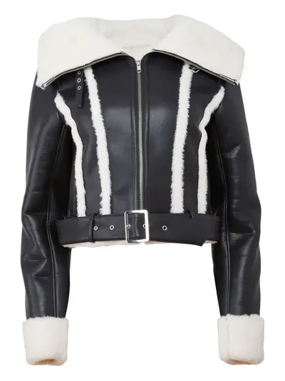 black faux shearling collar belted waist front zip fastening cropped