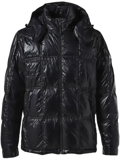 black down-filled detachable and adjustable hood zip closure zipped pockets embroidered details logo patch