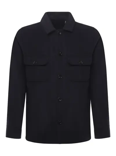 dark blue button fastening chest pockets long sleeves buttoned cuffs