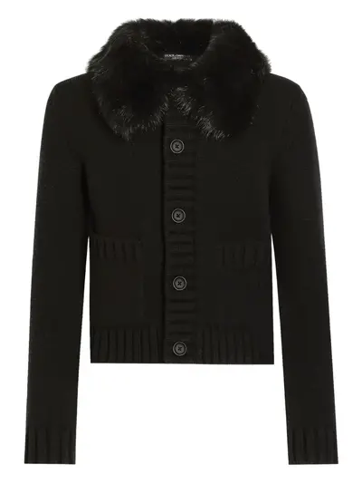 black faux-fur collar button fastening patch pockets ribbed trim knitted construction