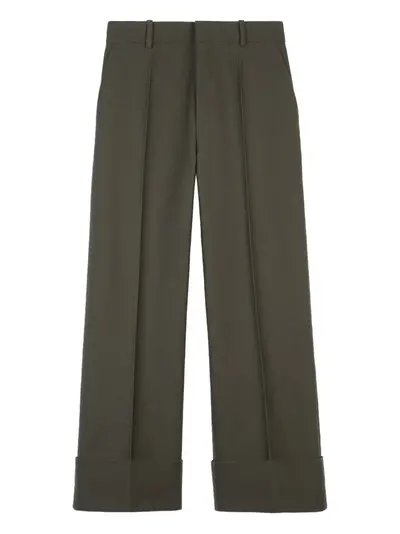 olive green cuffed hems front slant pockets back welt pocket gold-tone T logo centre-crease front