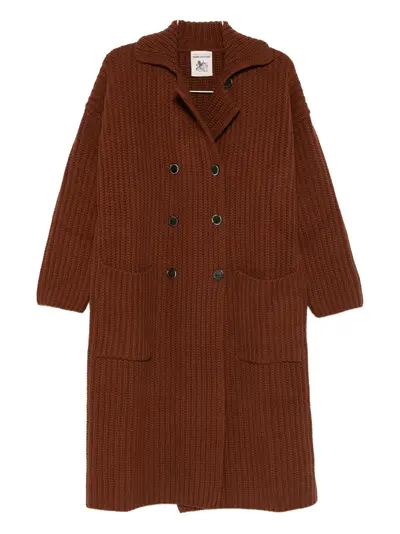 brown double-breasted button fastening notched lapels front patch pockets knitted construction