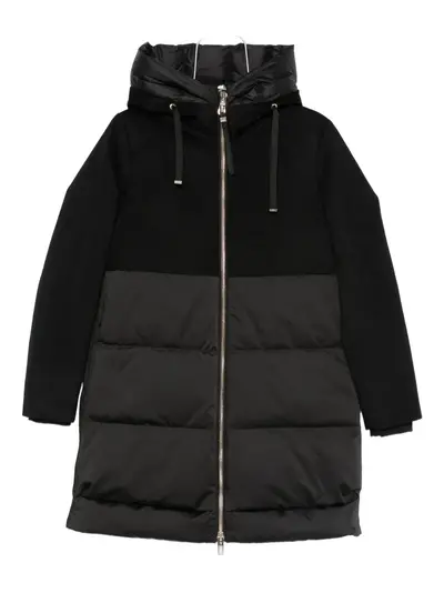 black two-way zip fastening drawstring hood long sleeves panelled design