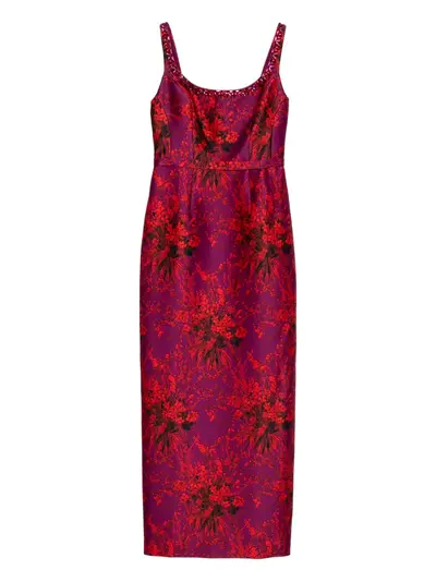 crimson red concealed rear hook and zip fastening all-over floral print crystal embellishment rear slit