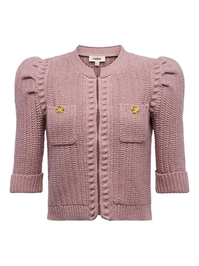 light pink puff sleeves cable knit button-embellished pockets patch pockets cropped length