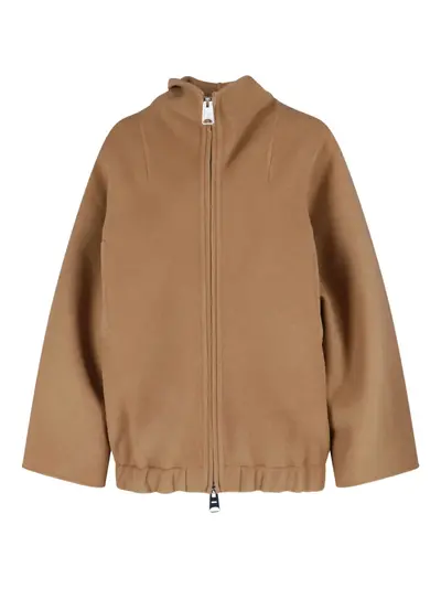 brown zip fastening elasticated hem wide sleeves high neck side welt pockets