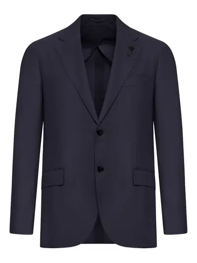 blue button fastening lapel collar chest welt pocket front flap pockets long sleeves