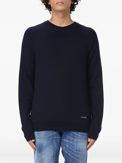 navy blue raglan sleeves ribbed hem ribbed cuffs crew neck metal plaque