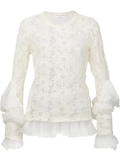 White wool floral lace blouse from Comme Des Garçons featuring a round neck, ruffled sleeves and semi-sheer tulle cuffs and hem.