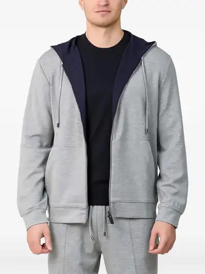 light grey drawstring hood zip fastening long sleeves side pockets ribbed hem