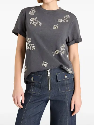 charcoal grey floral embroidery rolled sleeves relaxed fit crew neckline straight hem