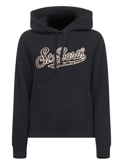 blue adjustable drawstring hood leopard embroidered kangaroo pocket ribbed cuffs and hem