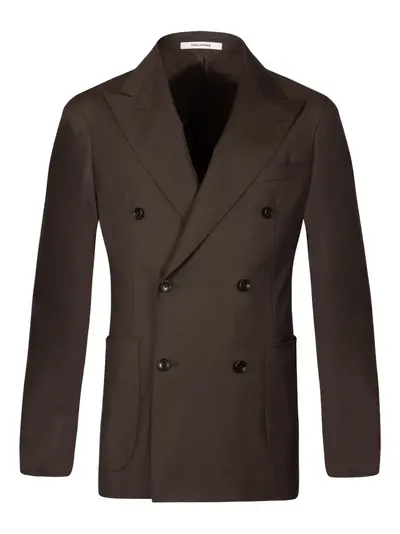 brown double-breasted button fastening peak lapels patch pockets long sleeves straight hem wool