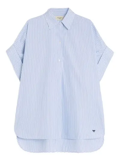 blue vertical stripes short sleeves collared neck curved hemline