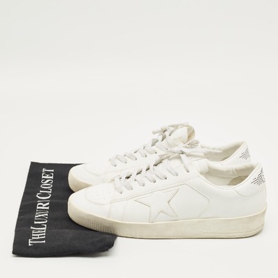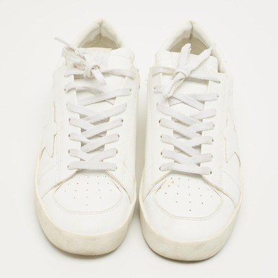 These Golden Goose Stardan sneakers come in white leather with a signature finish that creates an effortlessly worn in look. Designed with the brand’s signature star motif on the side and lace up closure, they offer a blend of casual ease and contemporary appeal.