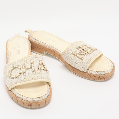 Stay comfortable throughout the day in effortless luxury with these Chanel slides. Ivory tweed stretches across the strap, while the cork style platform grounds the design in relaxed warmth. A gold tone chain intertwined with leather forms the logo at the front, hinting at the brand’s heritage and craftsmanship.