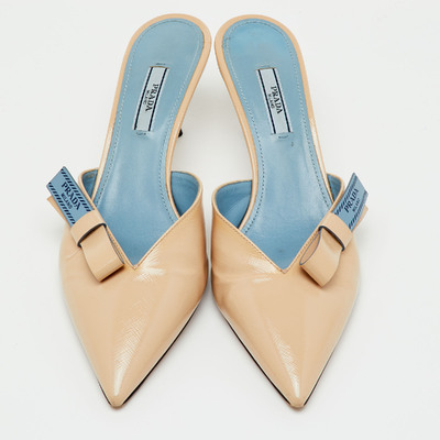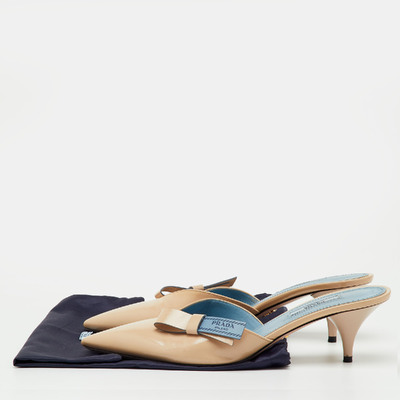 These pre owned Prada mules bring together clean lines and a soft beige sheen. The patent finish adds just enough polish, while the slip on shape keeps things easy. Perfect with cropped trousers or an airy dress.