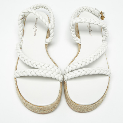 Crafted from supple white braided leather, these Gianvito Rossi espadrilles combine artisanal texture with refined ease. The elevated platform sole and adjustable ankle strap offer a balance of comfort and height, ideal for warm weather sophistication.