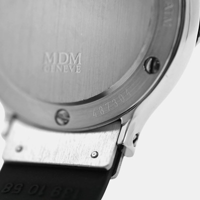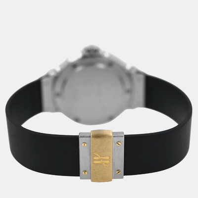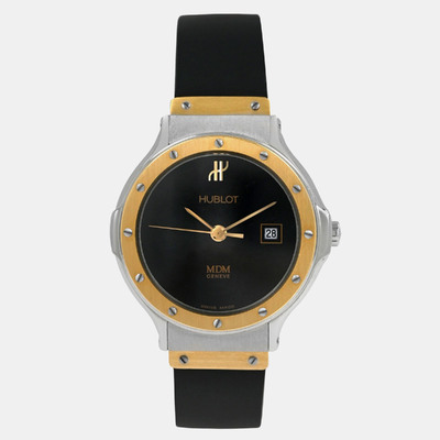 The Hublot MDM Classic 1393.2 blends stainless steel and 18k yellow gold with a dark black dial. Its 28 mm quartz design provides comfortable wear, ideal for those who appreciate simplicity and luxury in a smaller form.