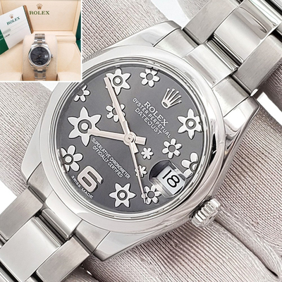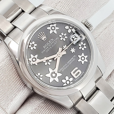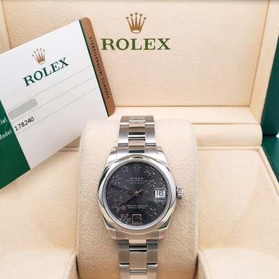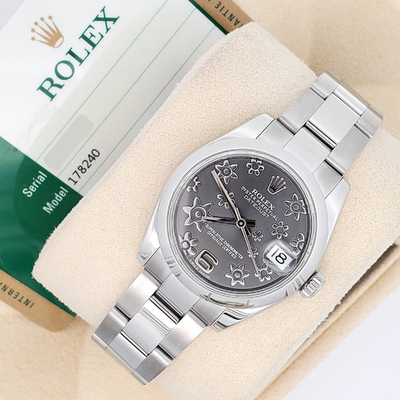 Delicately reimagined, the Rolex Datejust 178240 embraces feminine grace with its intricate grey floral dial. At 31 mm, this wristwatch balances understated charm and sophisticated design, ideal for those who appreciate a nuanced blend of tradition and modern artistry.
