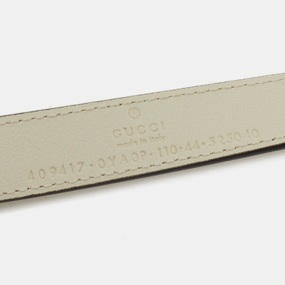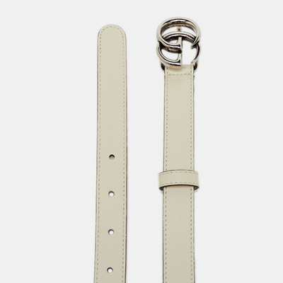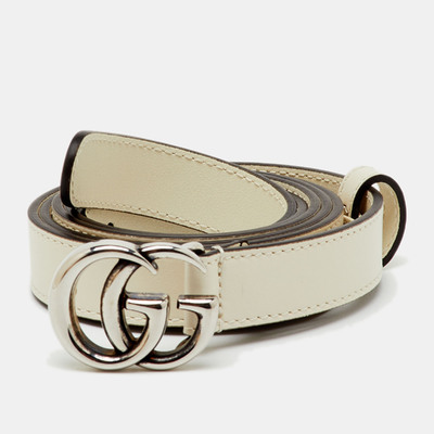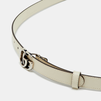 Crafted in supple ivory leather, this Gucci belt features the iconic GG Marmont buckle in an antique finish. The slim silhouette lends versatility, perfect for cinching tailored trousers or accentuating structured dresses.