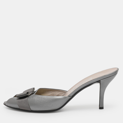 Salvatore Ferragamo Metallic Grey Leather Vara Bow Slide Sandals 40.5 1235121 (lpn31091182)