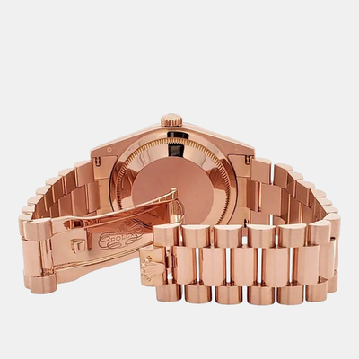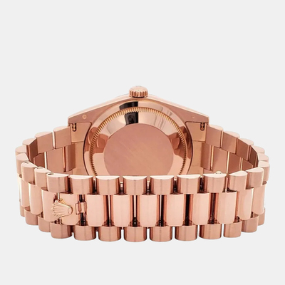 Warmth and opulence converge in the Rolex Day Date President 118205, where a sumptuous chocolate dial complements the glow of 18k rose gold. At 36 mm, this wristwatch radiates refined charm, making it the quintessential accessory for those who embrace classic luxury with a modern twist.