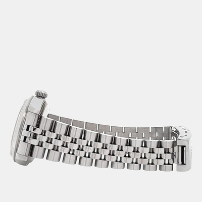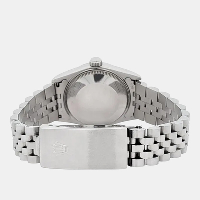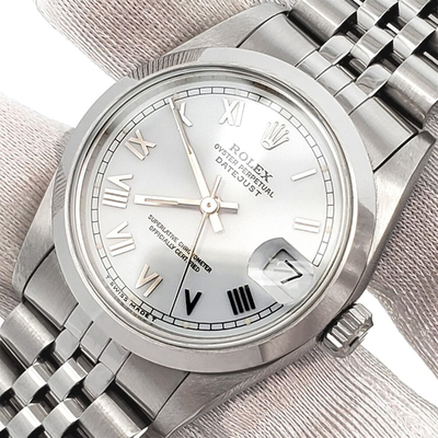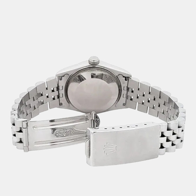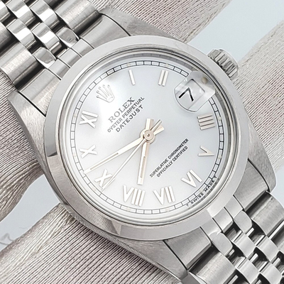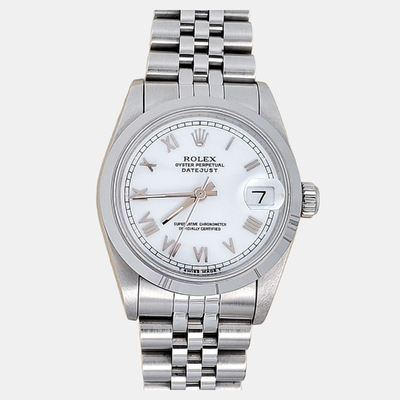 Pre owned Rolex Datejust with a clean white dial in a 31mm stainless steel case. Its automatic movement ensures dependable performance, and the sleek, minimalist design offers timeless sophistication. A verified authentic piece, ideal for women seeking understated elegance and reliable craftsmanship.