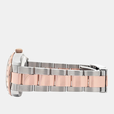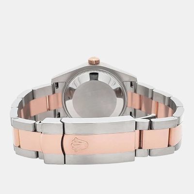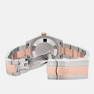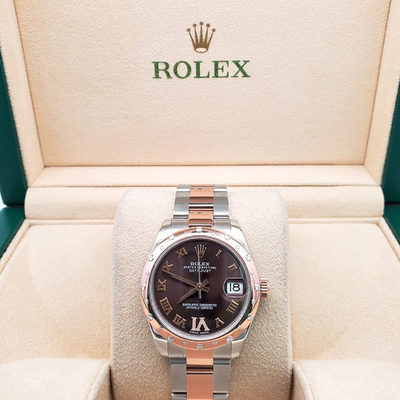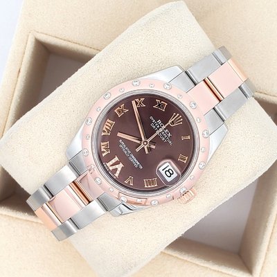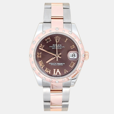 This pre owned Rolex Datejust presents a rich chocolate diamond dial in a 31mm case of 18k rose gold and stainless steel. Its automatic movement ensures smooth operation, while the warm tones and sparkling accents create a sophisticated and elegant look. Fully authentic, this watch embodies refined craftsmanship and modern femininity.