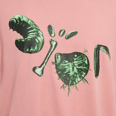 Soft pink jersey forms the base of this Dior Homme T shirt, with a striking insect logo printed across the front. The fabric drapes naturally, creating a relaxed silhouette, while the graphic detail adds a playful edge to the look.