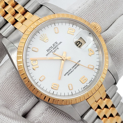 This authentic pre owned Rolex Date 15223 is an elegant designer automatic wristwatch that showcases Rolex’s hallmark craftsmanship and timeless luxury. Crafted in white and 18k yellow gold stainless steel, this 34 mm women’s timepiece exudes refined sophistication and versatile style. A pre loved Rolex watch is perfect for collectors and enthusiasts seeking a high end accessory with classic appeal and enduring elegance.